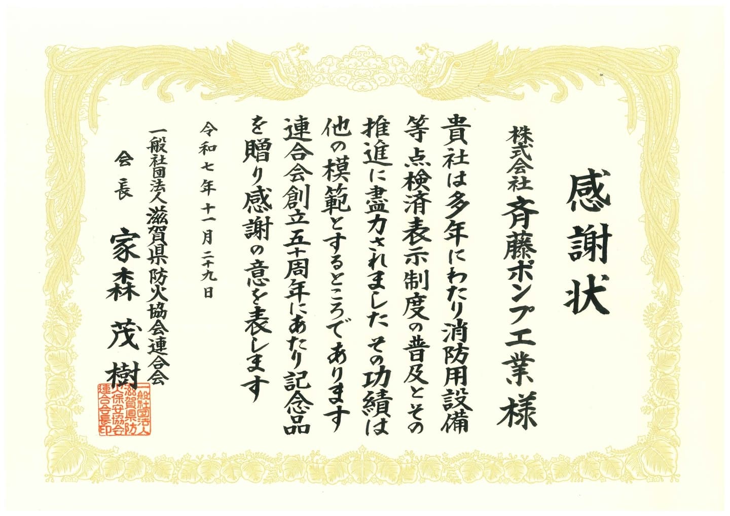 | 2025.12.01 | 一般社団法人滋賀県防災協会連合会様より、株式会社斉藤ポンプ工業へ感謝状をいただきました。 今後も防災に関わる者として努力を続けて参ります。