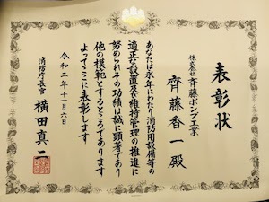 | 2020.11.06 | 「令和2年度 消防設備保守関係功労者」として消防庁より表彰していただきました。   |